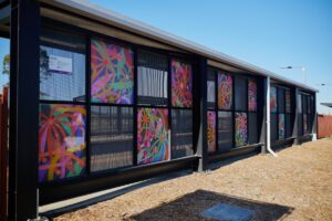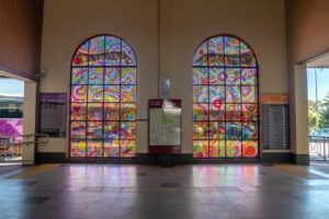 – Bendigo Railway Station with a piece named “Love in Neon” by Carly Wood with its vibrant rainbow palette and motifs of hearts, flowers and suns, giving an explosion of colour.